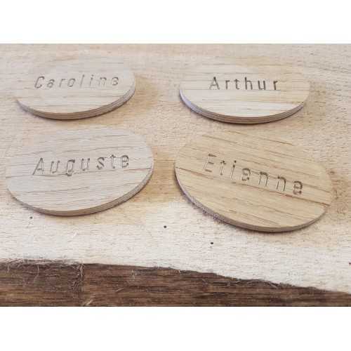 Ces jolis Marque prénoms en contreplaqué plaqué Chêne sont personnalisables avec les prénoms de vos invités pour mariage, baptême, communion ...